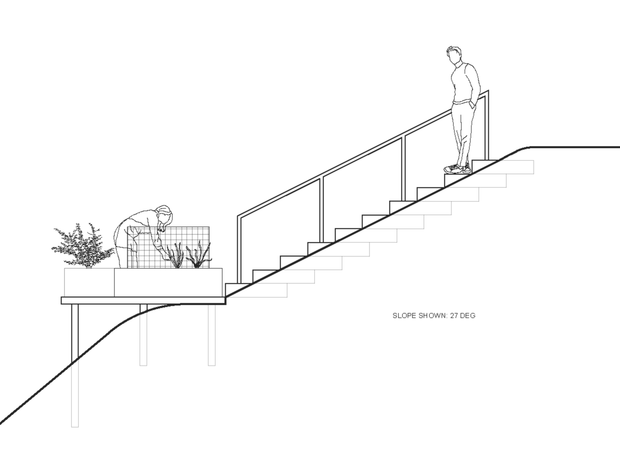 I settled on designing a staircase with a platform for the garden, both made of grated metal. In addition to being fireproof, grated metal does not impede drainage, it’s lightweight, and structures made with this material can be pre-fabricated, which makes for quick installation on-site. The platform at the bottom of the stairs was large enough to accommodate 30 square feet of growing space in raised beds, with room remaining for a bench. The whole structure floated just above the hillside, which minimized the amount of digging required, and water was provided by running a hose alongside the stairs, terminating at a faucet down on the platform.