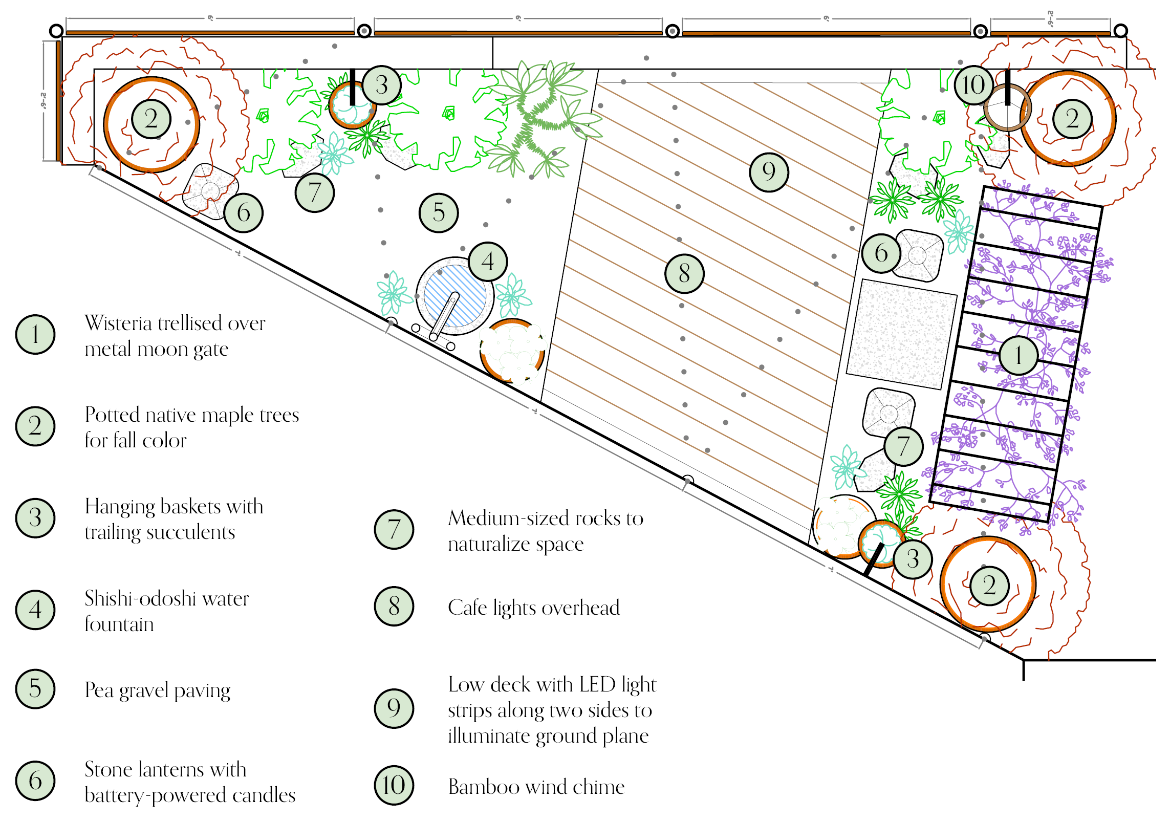 Clients wanted a Zen garden with a sense of privacy for yoga and meditation, but the only available site for this garden was a narrow, triangular space squished between the clients’ garage and neighboring properties. Additional client concerns included sound pollution and fire defense.