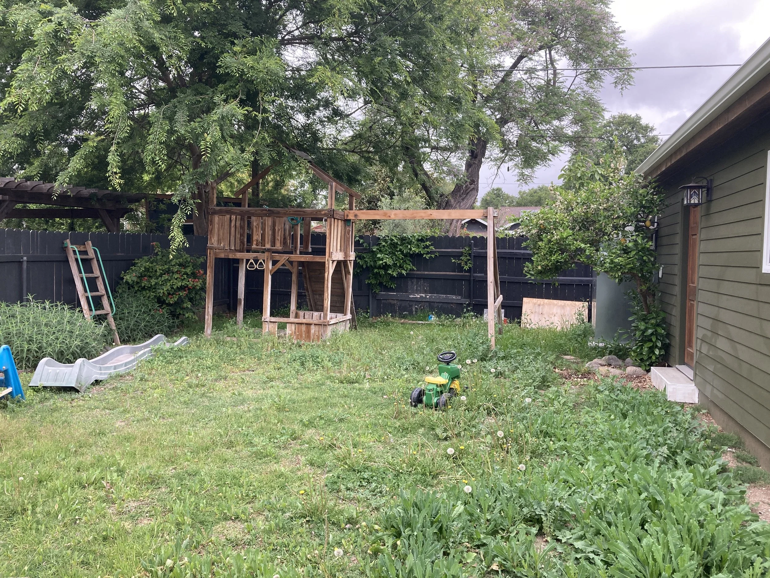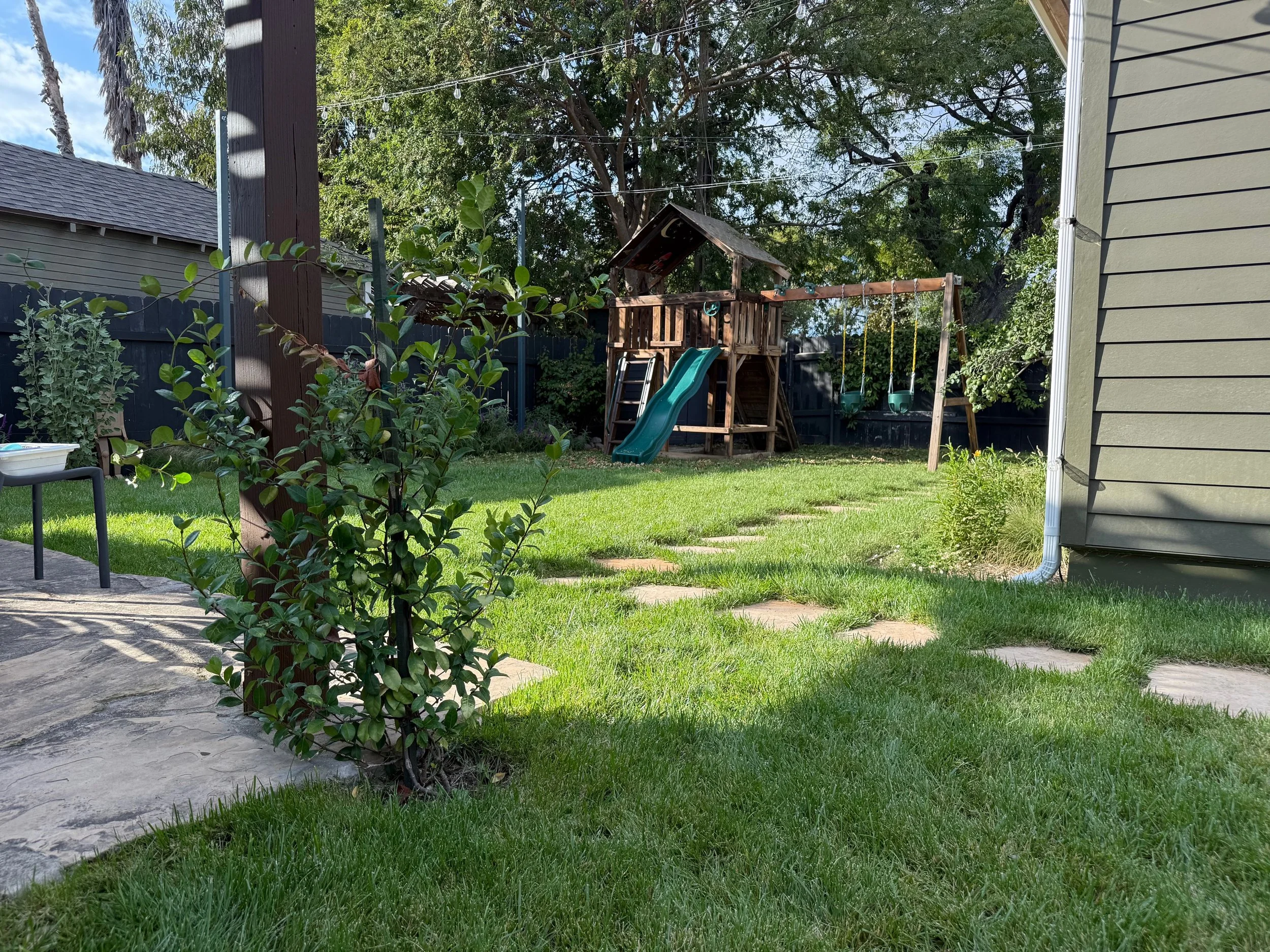 Thankfully, the family had already lined up a contractor to work with. As I pushed out designs for different portions of the property, the contractor got to work installing, which really sped this project along. The top six inches of soil were removed and disposed of as toxic waste. New soil was brought in and a new lawn was plotted - smaller than the old lawn, but big enough for kids to play. Planting beds were installed along the borders, stepping stones created a clear path through the space, and cafe lights were hung from poles to illuminate the backyard at night. The family rehabilitated their play structure, and the result was a beautiful and safe place to enjoy.